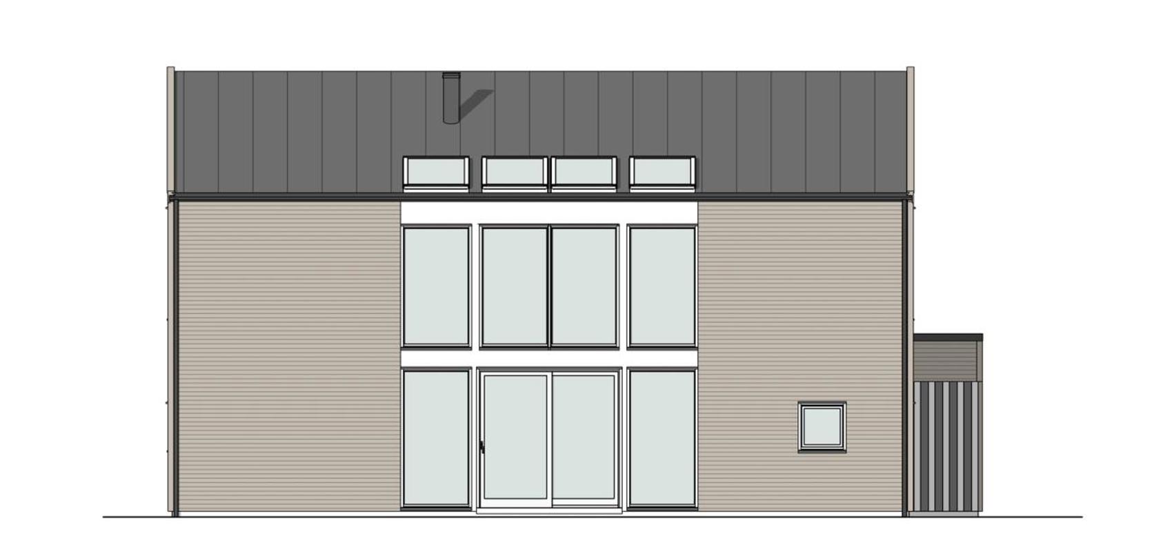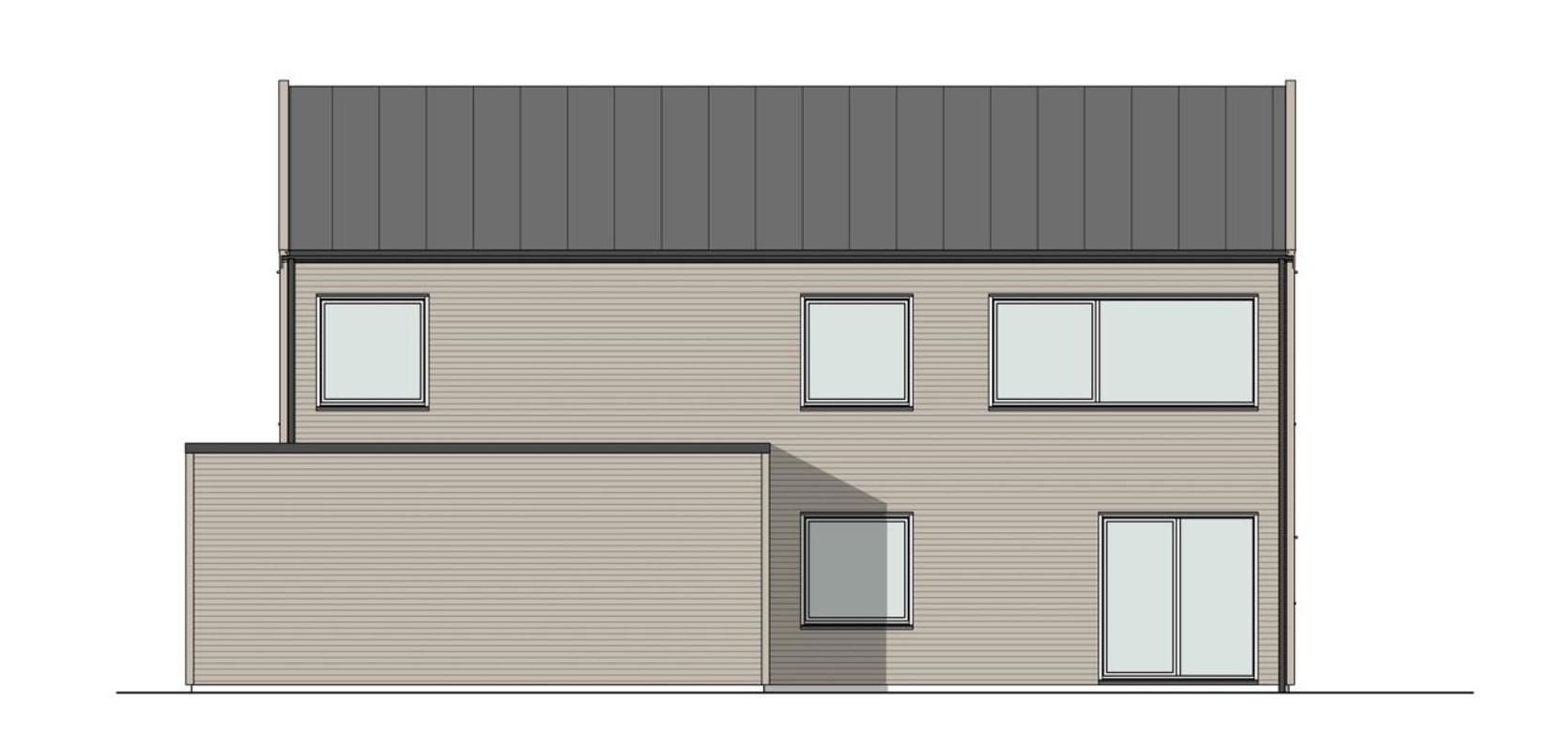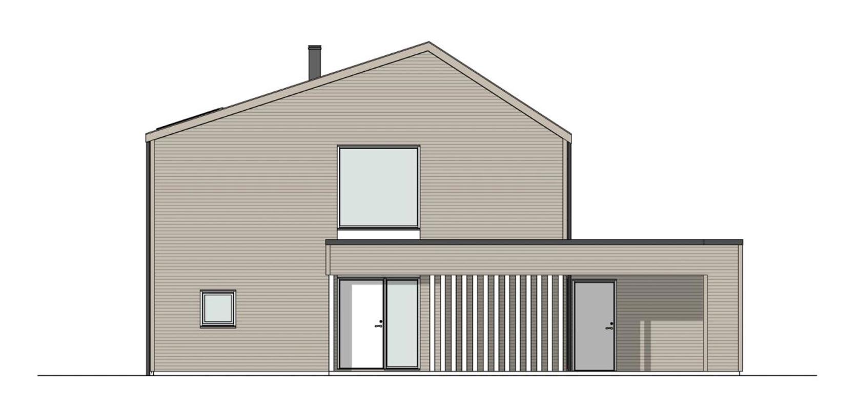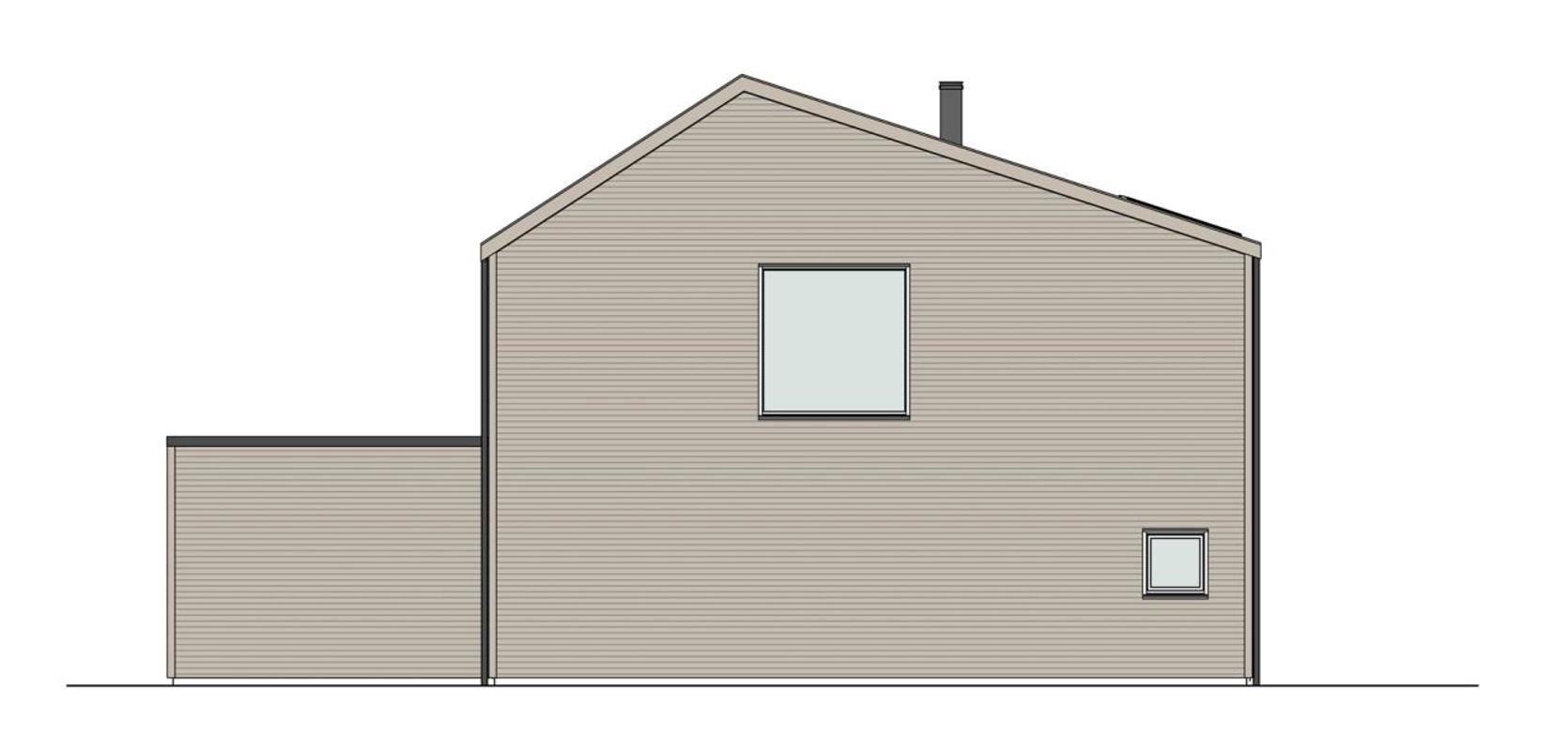 Mønet på saltaket er forskjøvet i forhold til midten av taket. Dette gir boligen et moderne og originalt utrykk, og gir også rom for en større takhøyde i andre etasje.