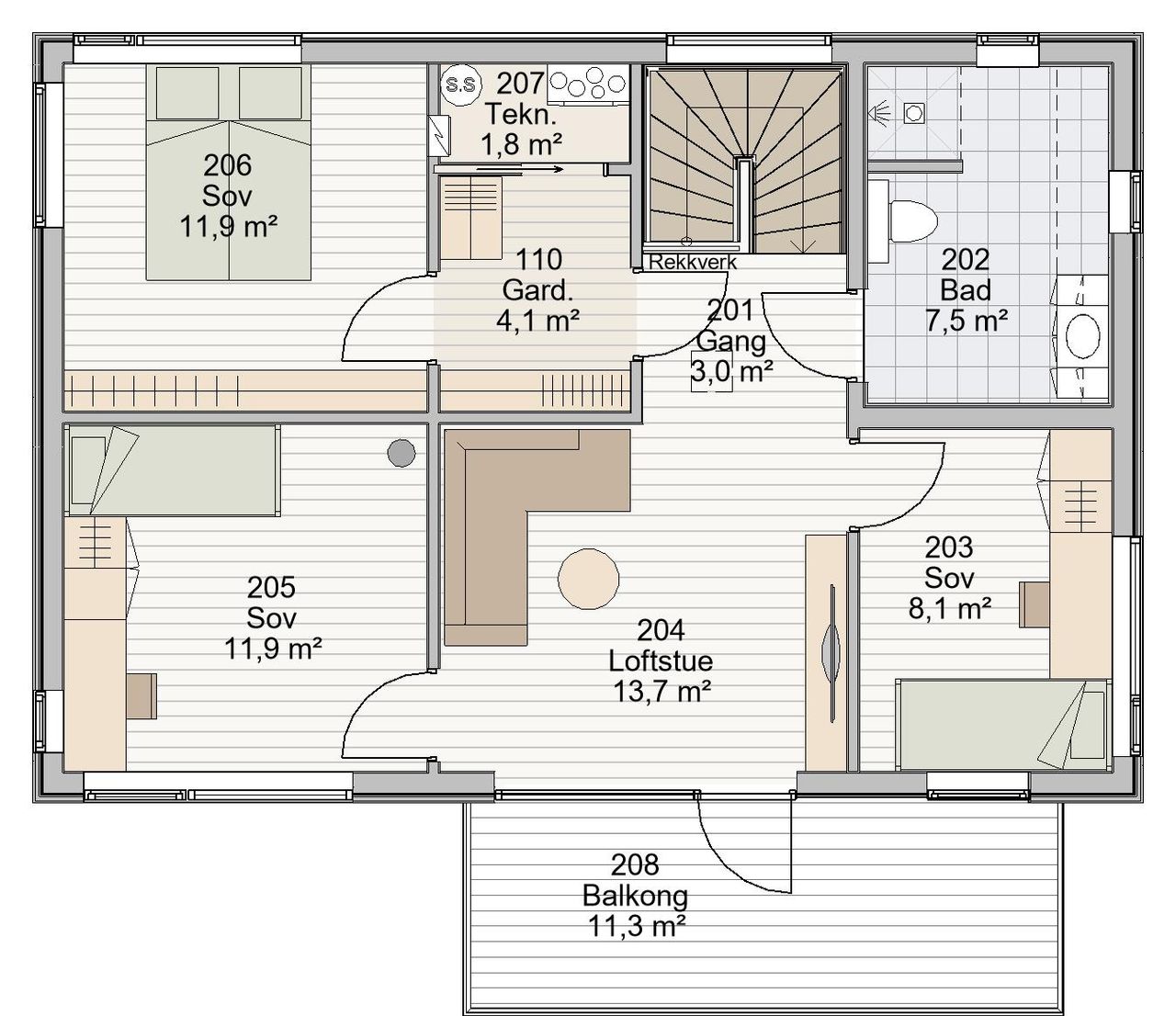 I andre etasje finner du tre romslige soverom, et bad og en loftstue som gir ekstra plass til lek, filmkvelder eller avslapning. Den tilknyttede balkongen gir en fantastisk utsikt og tilfører huset en ekstra moderne detalj som skiller det ut.
