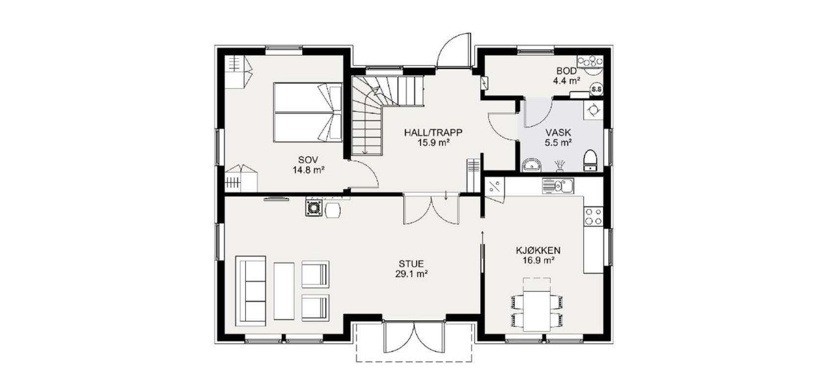 Velger du Mesterhus Kine med allromsløsning, får du god plass til en egen frokostkrok og et langbord for familie og venner. Du kan også legge til en peis, for de som drømmer om det.