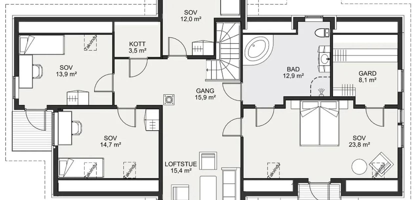 Her har du fire soverom, et gjesterom, stort kjøkken og en vinkelstue, to bad og eget vaskerom, samt en romslig loftstue. Du kan til og med velge å ha flere peiser i huset hvis du ønsker det.