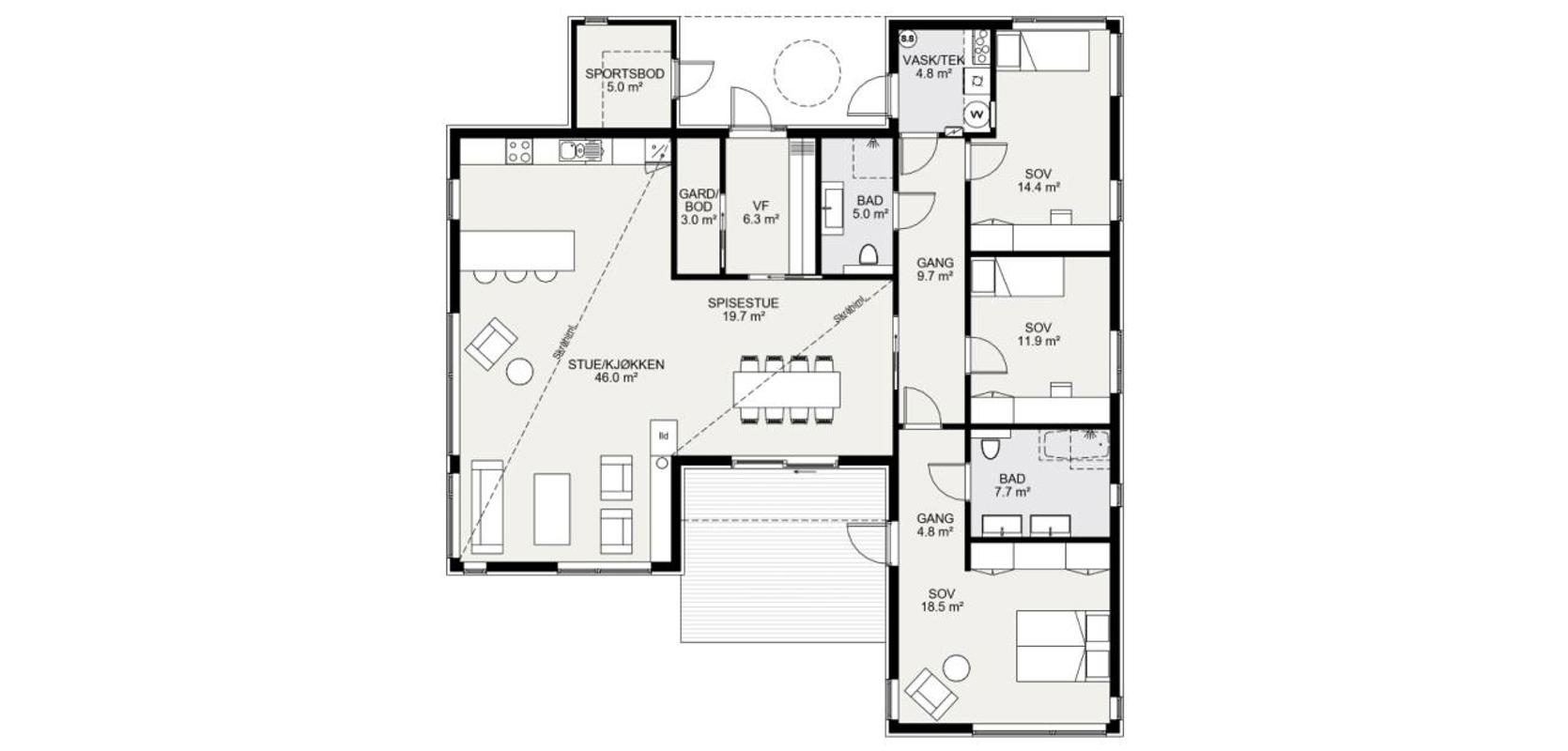 Inngangspartiet er elegant overbygd, og her finner du også en utendørs sportsbod med praktisk tilgang til vaskerommet. Dette huset er en drøm for de som lengter etter rikelig med plass og et praktisk planløsning, alt på samme plan.