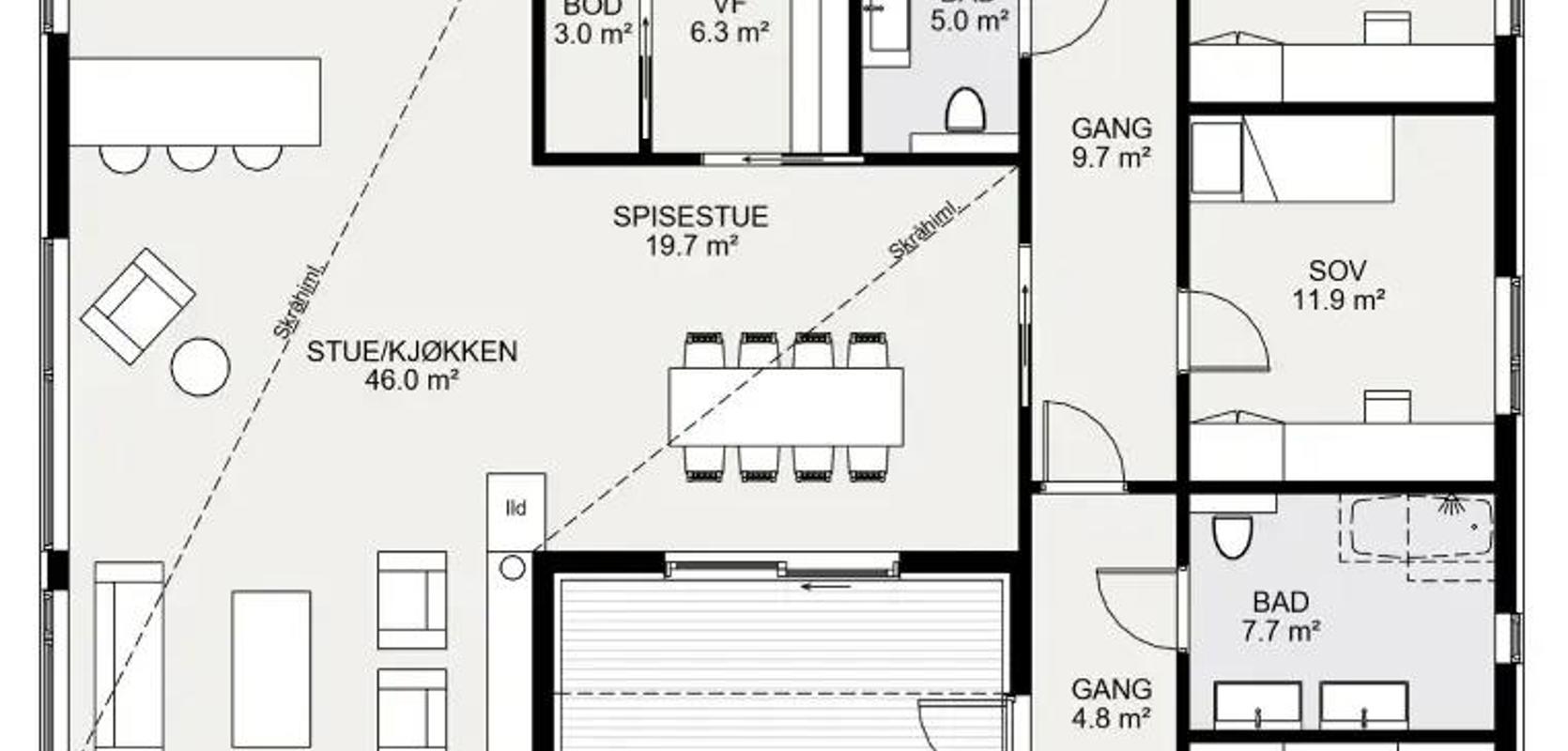 Stryn er et romslig og stilfullt hus med unikt og moderne design. Funksjonell og god romdeling med ulike fløyer, og alt på ett plan.