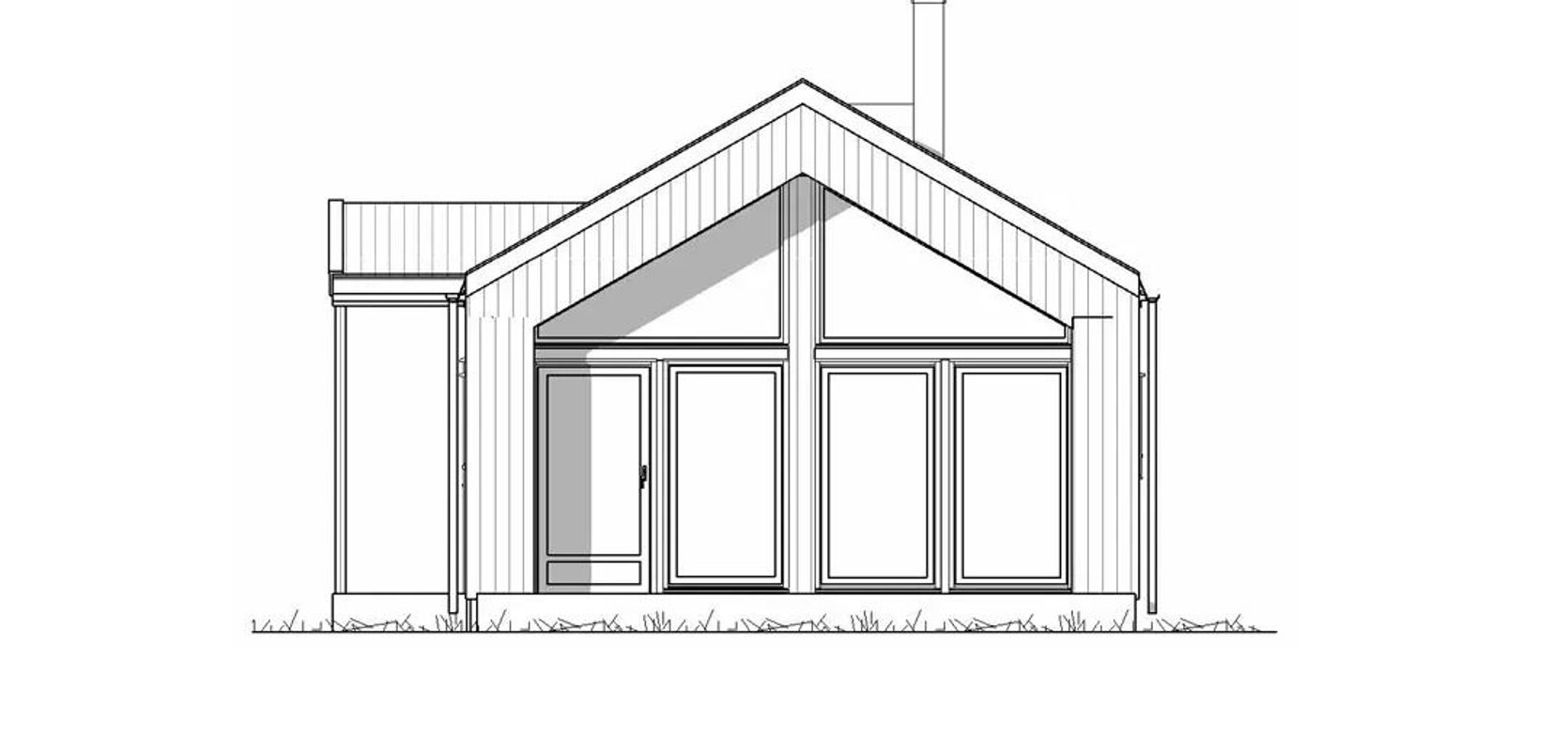 Spiseplass ligger i nær tilknytning til kjøkkenet og gavlveggen med store, høye vinduer og utgang til uteplassen i sør. Ildstedet er sentralt plassert i hoveddelen og kan nytes fra hele oppholdsrommet.