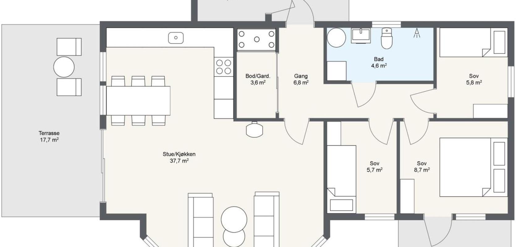 Første etasjen har en romslig åpen stue- og kjøkkenløsning. Oppholdsrommet har god plass til et koselig spisebord hvor du kan nyte måltider med familien. Det er også mye lagringsplass i det romslige kjøkkenet. Det kommer godt med og bidrar til å holde hytta ryddig. Midt i rommet finner du den perfekte plassen for en sofagruppe hvor du kan slappe av med familien, enten det er for å spille brettspill eller lese en god bok.