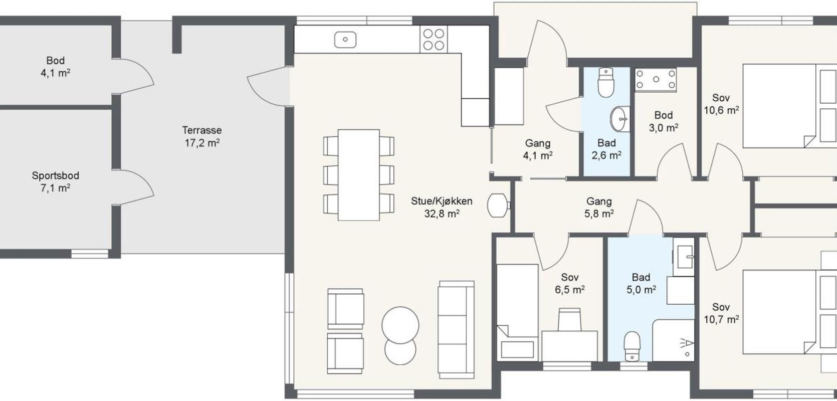 I soveromsavdelingen finner du tre komfortable soverom, en praktisk bod og et velutstyrt bad. Boden kan fungere utmerket som en ekstra garderobe eller som lagringsplass.