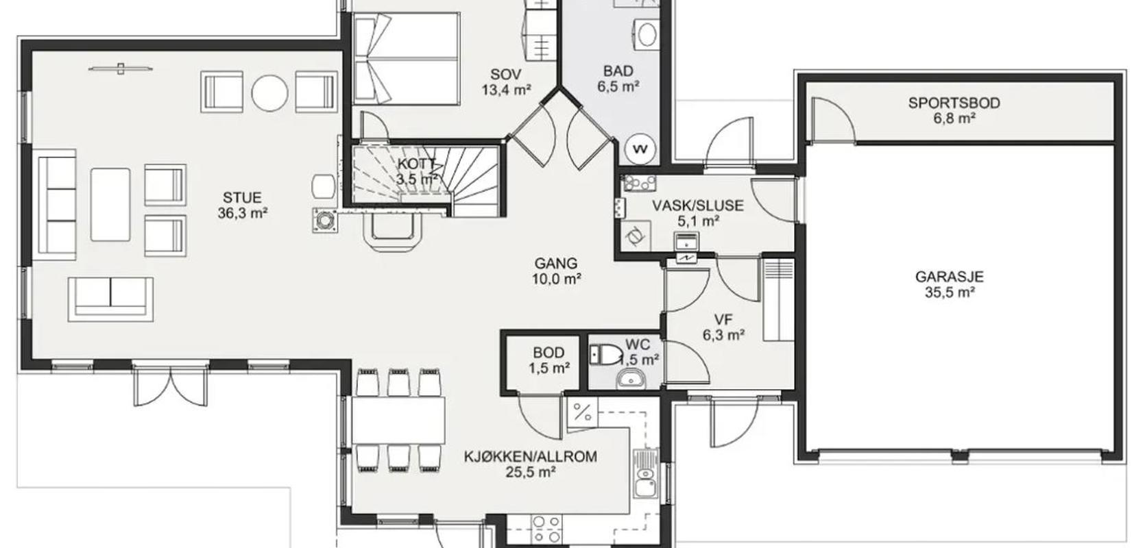 Med fire soverom og store oppholdsrom kan Mesterhus Norunn tilpasses enhver livsfase. Bad finnes i begge etasjer, og gir ekstra komfort og bekvemmelighet.